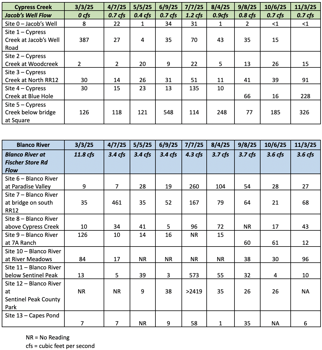 The Wimberley Water Advisory Group, a group of volunteers, has monitored both Cypress Creek and the Blanco River near Wimberley for E. Coli bacteria for decades.  Long-time supporters of this data gathering effort, the Watershed Association is coordinating with Pete Anderson and the volunteers to expand the availability of this monthly data collected during the swim season.
